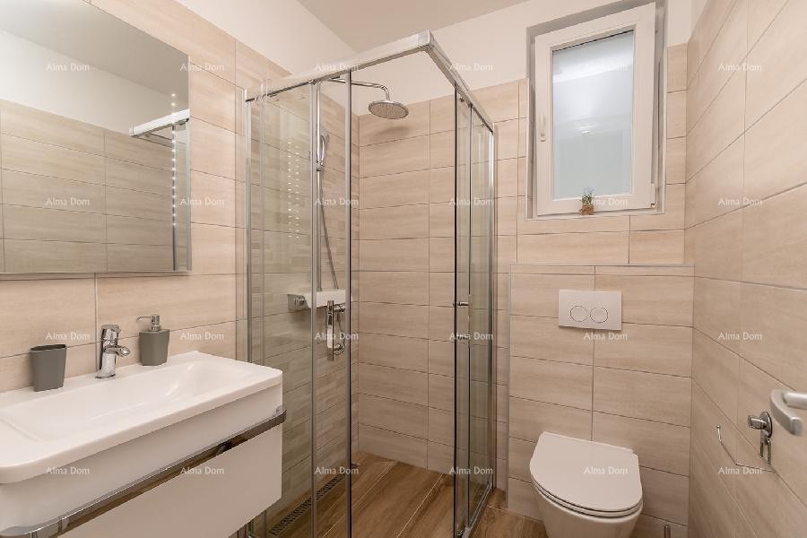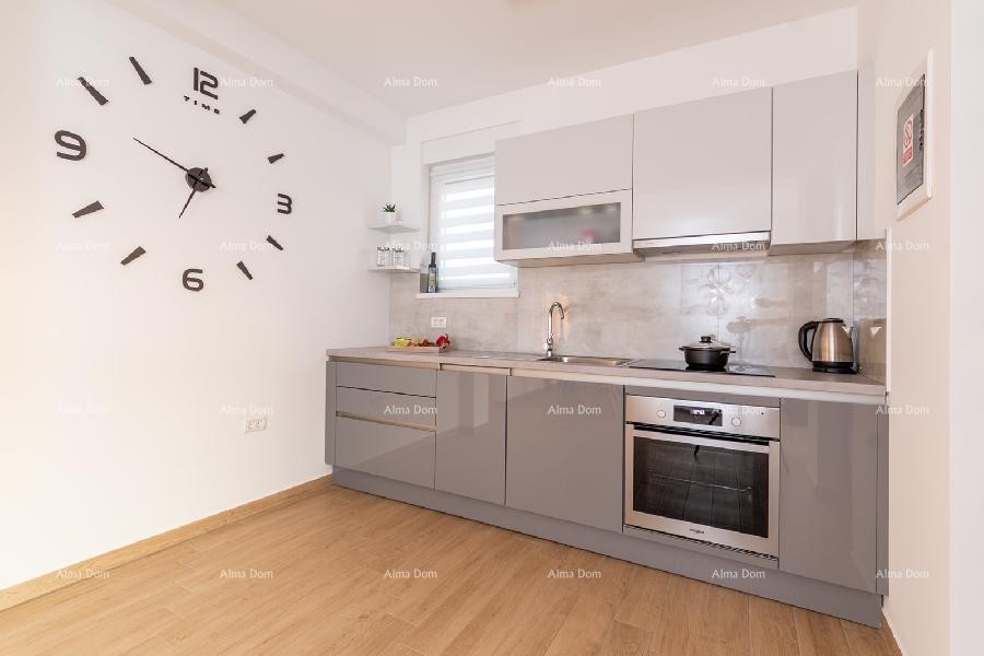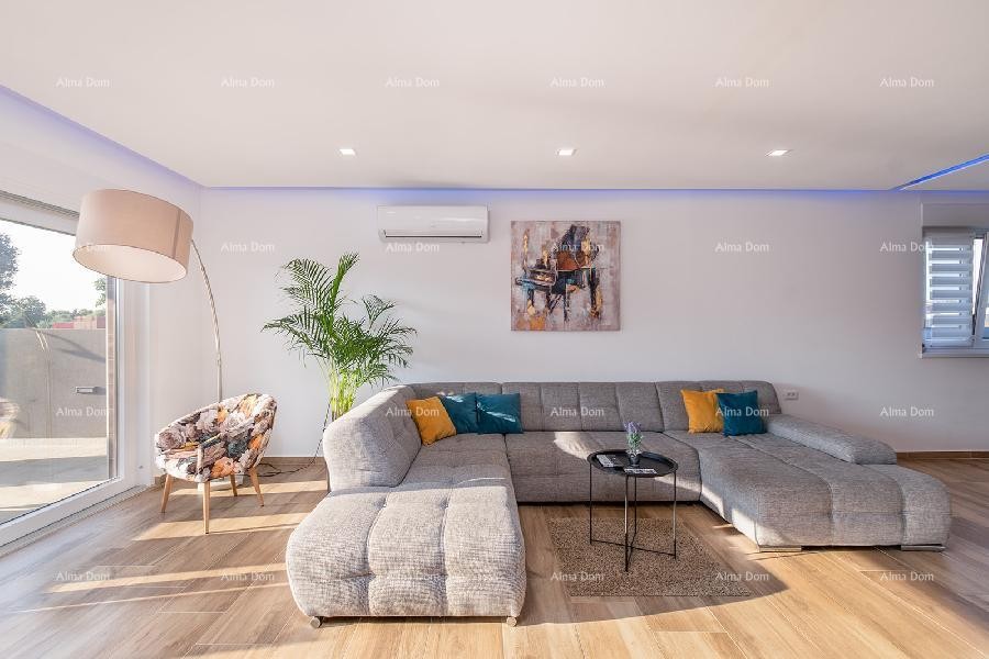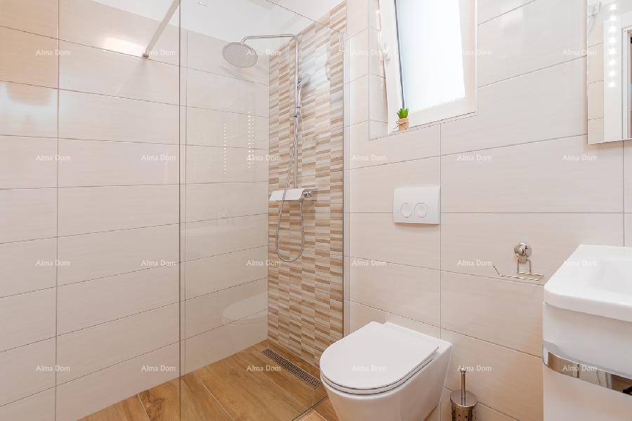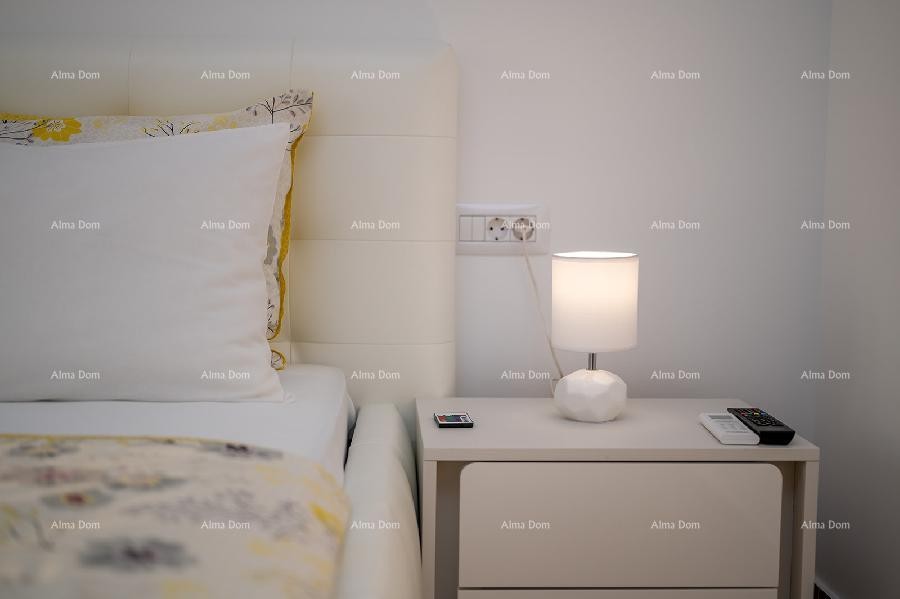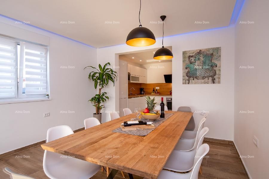 pritličje-dnevna soba in kuhinja, izhod na bazen, kopalnica, v drugem nadstropju pa je spalnica z veliko teraso.
