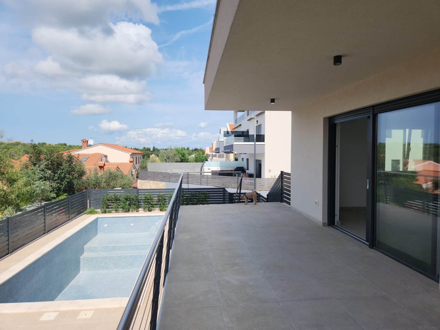 Na terasi so izvedene vse potrebne instalacije za vgradnjo poletne kuhinje in jacuzzija. S terase vodi niz stopnic v območje za počitek z bazenom in sončališčem. Kupca čaka odločitev glede oblog v bazenu - folija, ploščice ali drugo.