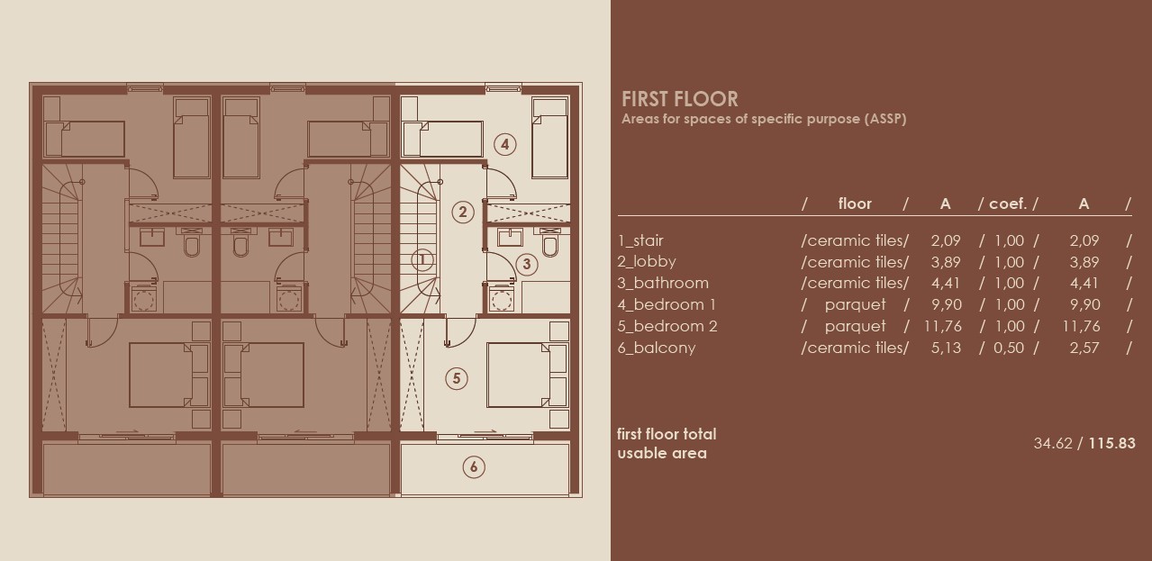 Apartma 3 s površino 115,83 m² vključuje pritličje, 1. nadstropje in 2. nadstropje.