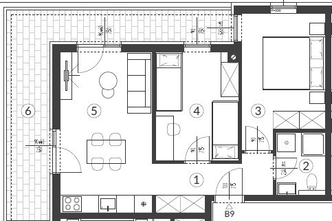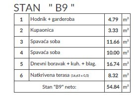 Stan B9, površine 54,84 m2, se nahaja v 2. nadstropju stavbe in obsega: hodnik + garderoba, dnevna soba s kuhinjo in jedilnico, 2 spalnici, kopalnico in pokrito teraso.