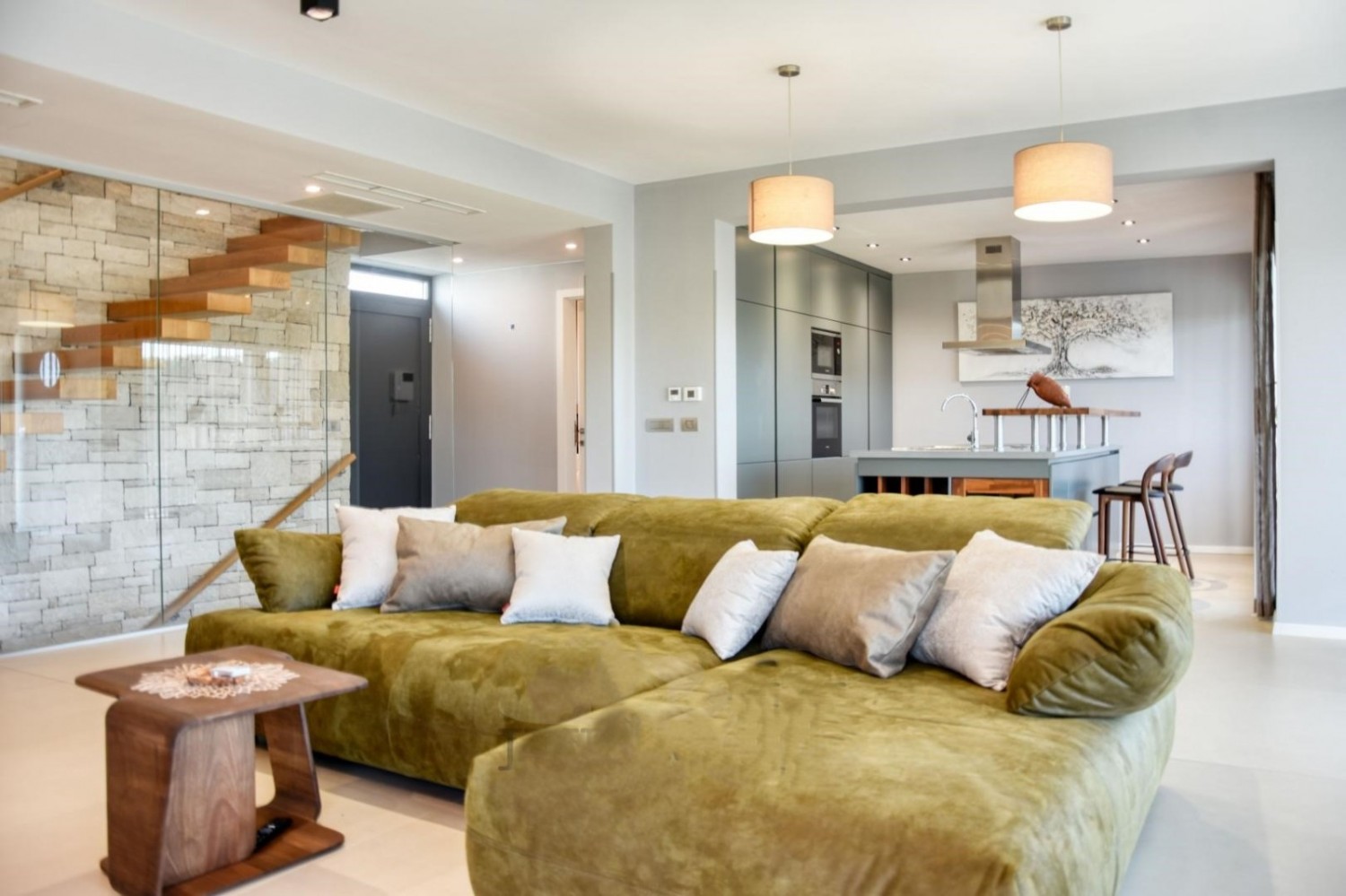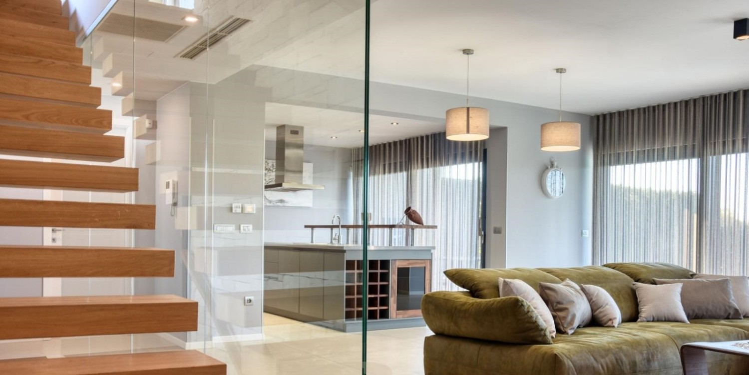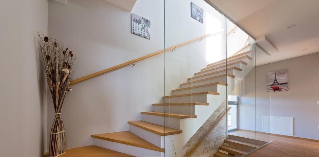Prvo nadstropje hiše je zasnovano kot prostoren odprt koncept, ki združuje dnevno sobo, kuhinjo in jedilnico, opremljene z vrhunskim oblikovalskim pohištvom. Kuhinja z otokom in velikimi steklenimi stenami omogoča obilico naravne svetlobe ter neposreden izhod na teraso in bazen. Na istem nadstropju se nahajajo shrambe/garderoba, gostinska WC in kamin na drva, ki prostoru daje dodatno toplino in prijetno vzdušje.