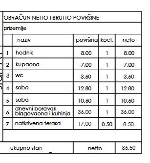 Stan se nahaja v pritličju in obsega hodnik, 2 spalnici, kopalnico, dnevno sobo s kuhinjo in jedilnico, WC ter pokrito teraso.
