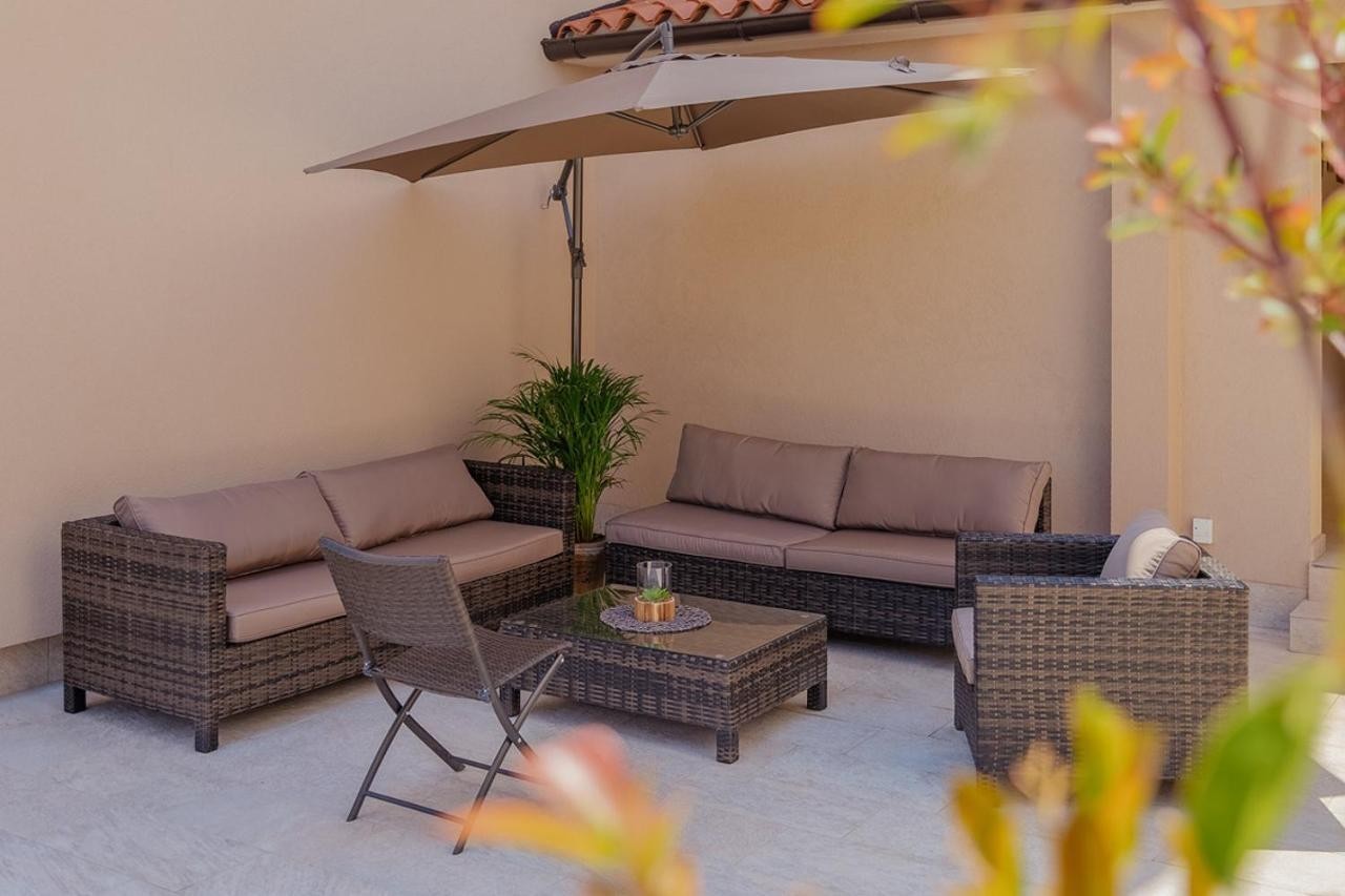 Nahaja se na mirni lokaciji, ima 180m2 bivalne površine, dve etaži, pritličje in nadstropje. V pritličju hiše je dnevna soba s kuhinjo in jedilnico, spalnica, pralnica in kopalnica. Stopnišče vodi v prvo nadstropje, kjer so tri spalnice, od katerih ima ena lastno kopalnico ter skupno kopalnico in teraso. Vila ima parkirišče za dva avtoila, zelenico in bazen 6x3 s teraso za sončenje. Ob bazenu je lepo urejena konoba s kaminom. Do prve plaže 800 m.Uspešno oddano v turistične namene.