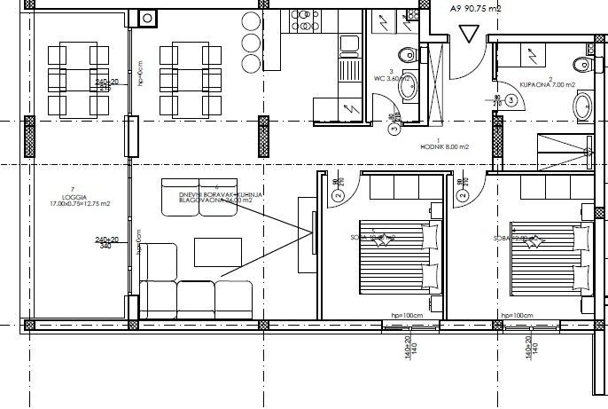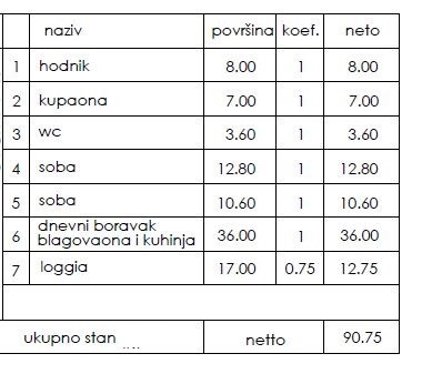 Stan se nahaja v 1. nadstropju stavbe in obsega hodnik, 2 spalnici, kopalnico, dnevno sobo s kuhinjo in jedilnico, WC ter loggio.