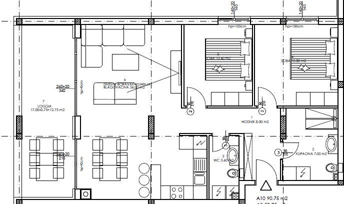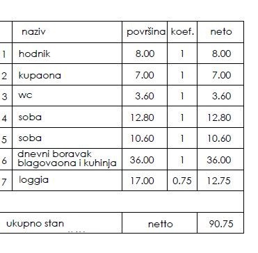 Stan se nahaja v 1. nadstropju stavbe in obsega hodnik, 2 spalnici, kopalnico, dnevno sobo s kuhinjo in jedilnico, WC ter loggio.