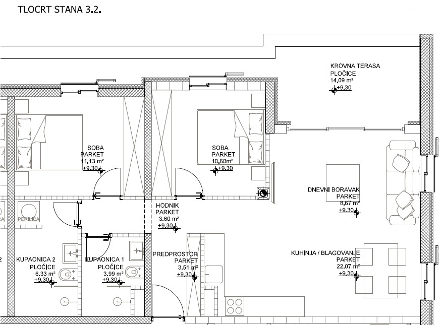 Stanovanje z oznako 3.2 ima funkcionalno razporeditev in je sestavljeno iz:
