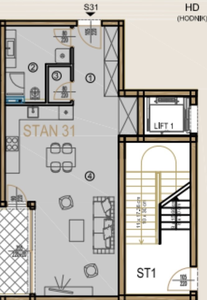 Stanovanje S31 se nahaja v prvem nadstropju in obsega hodnik z garderobo, kopalnico, dnevno sobo s kuhinjo in jedilnico ter loggio.