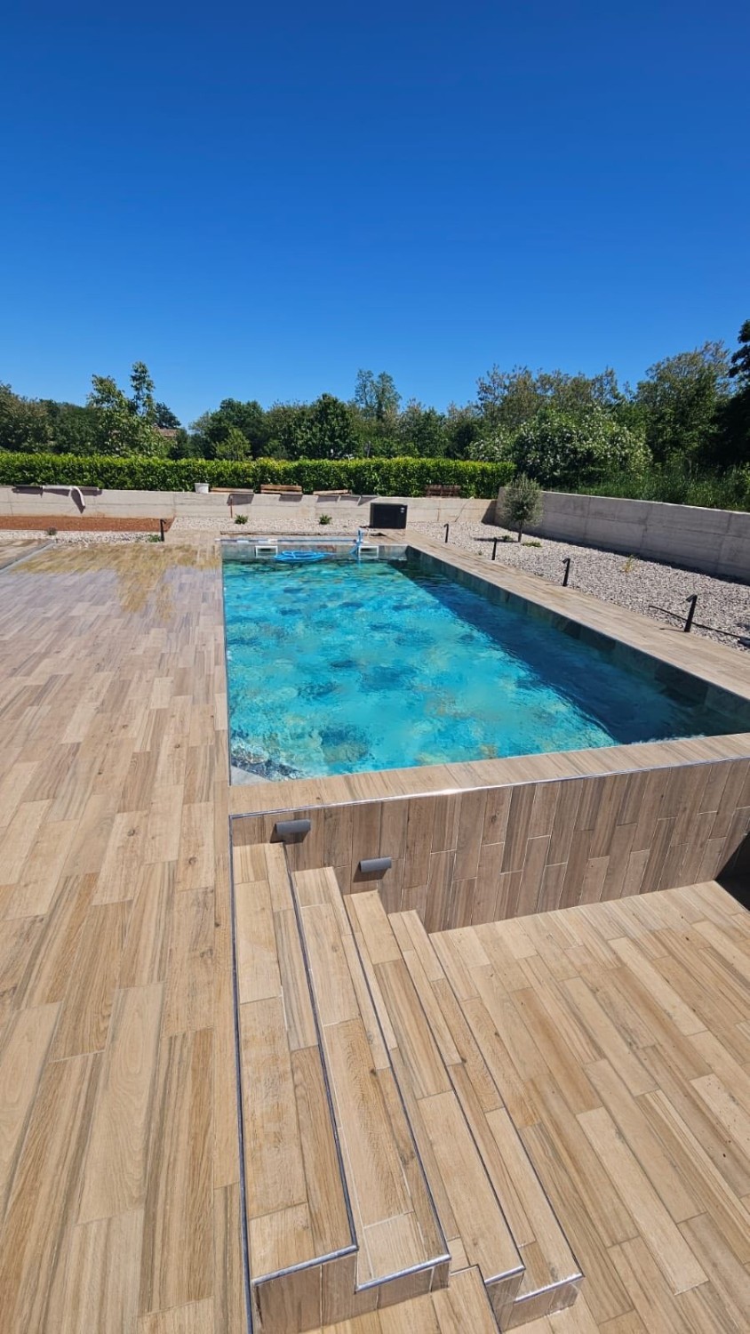 Na prodajo je moderno urejena vila velikosti 185 m², ki se nahaja na prostornem zemljišču velikosti 1.207 m² v mirnem in zelenem okolju blizu Labina. Hiša se razteza čez dva nadstropja in vsebuje štiri spalnice, prostorno dnevno sobo ter kuhinjo z jedilnico. Dve kopalnici in dodaten WC zagotavljata dodatno praktičnost. Uživajte v idiličnem vrtu z ogrevanim bazenom in pokrito teraso, idealno za sprostitev ali druženje.