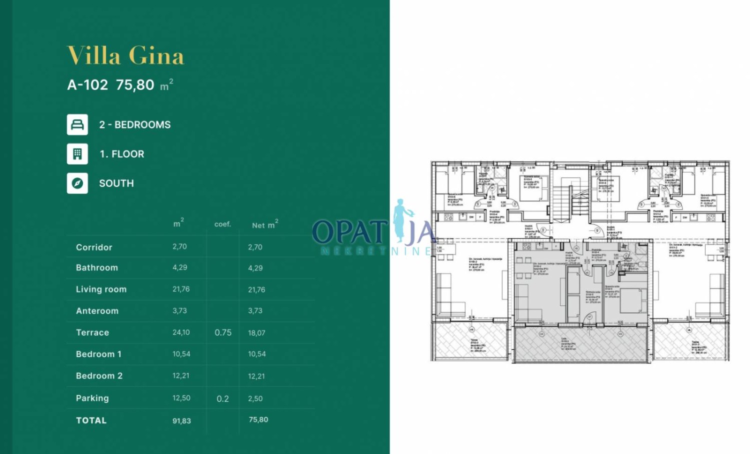 Razpored prostorov je funkcionalen in dobro zasnovan. Stanovanje obsega dve spalnici, hodnik, odprto kuhinjo z dnevnim in jedilnim prostorom, kopalnico ter veliko teraso.
