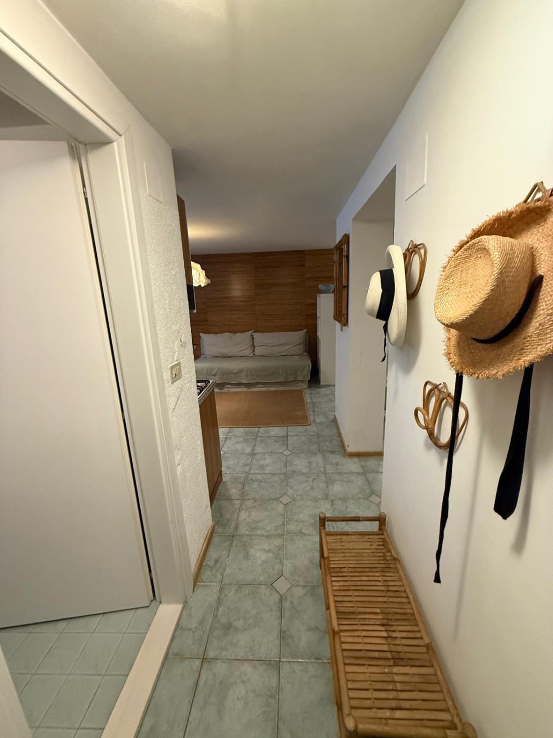 V spodnjem, polsuterenskem delu se nahajajo vhodni hodnik, kopalnica ter kuhinja z dnevnim prostorom in spalnim delom, notranje stopnice pa povezujejo ta del z ostalim delom hiše.