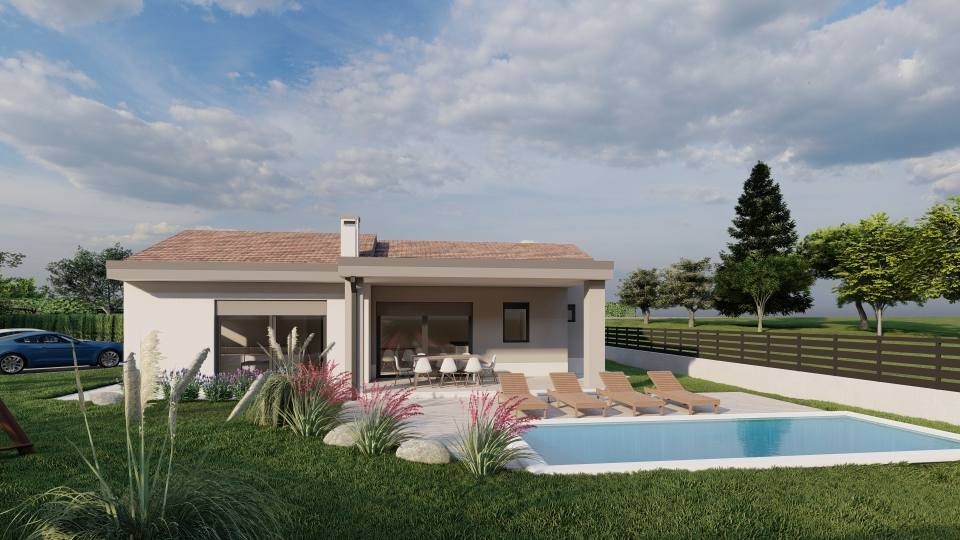 Na prodajo je hiša pritličnica s bazenom v gradnji, nameščena v mirnem okolju Savičente.