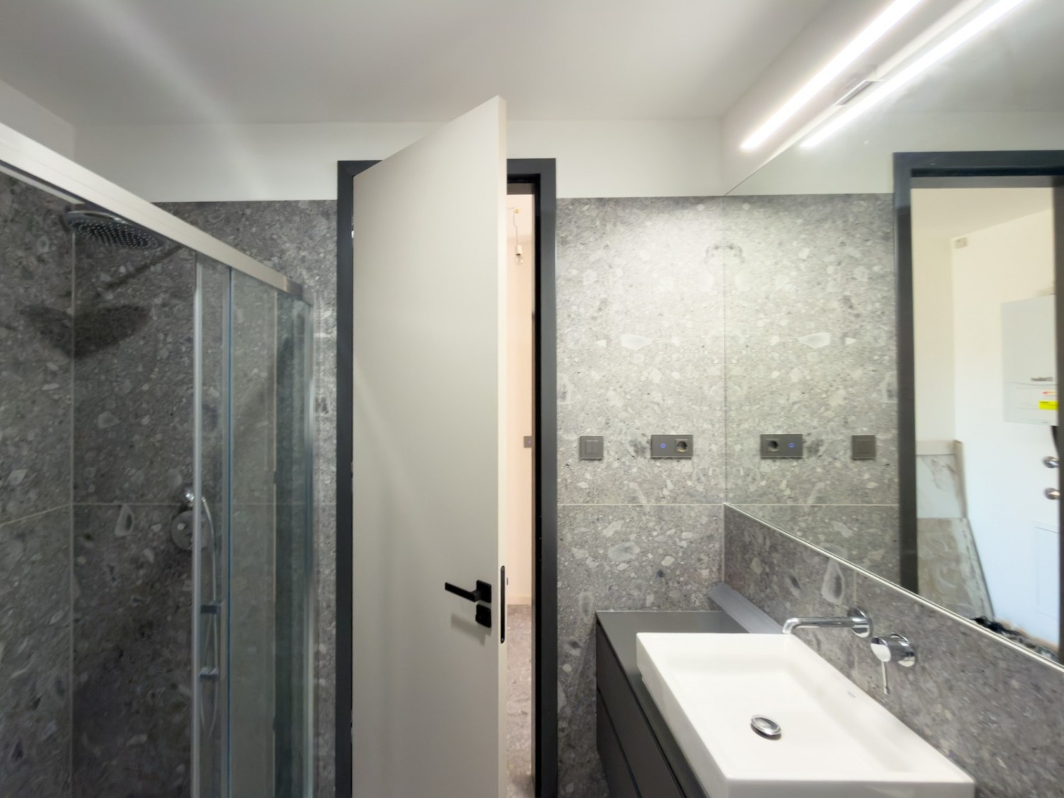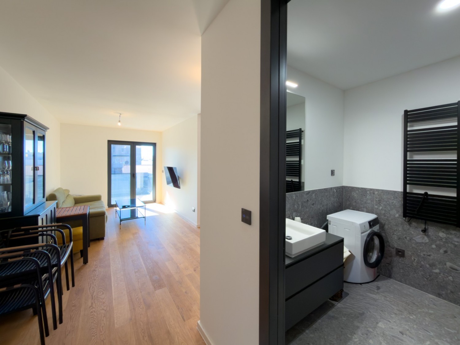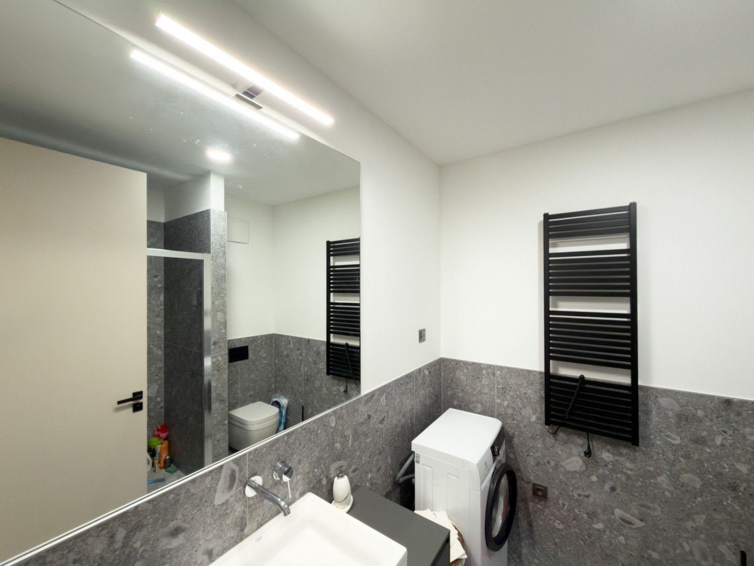 - Keramične ploščice velikih formatov (90x90 in 60x120) v kuhinji, hodniku in kopalnici