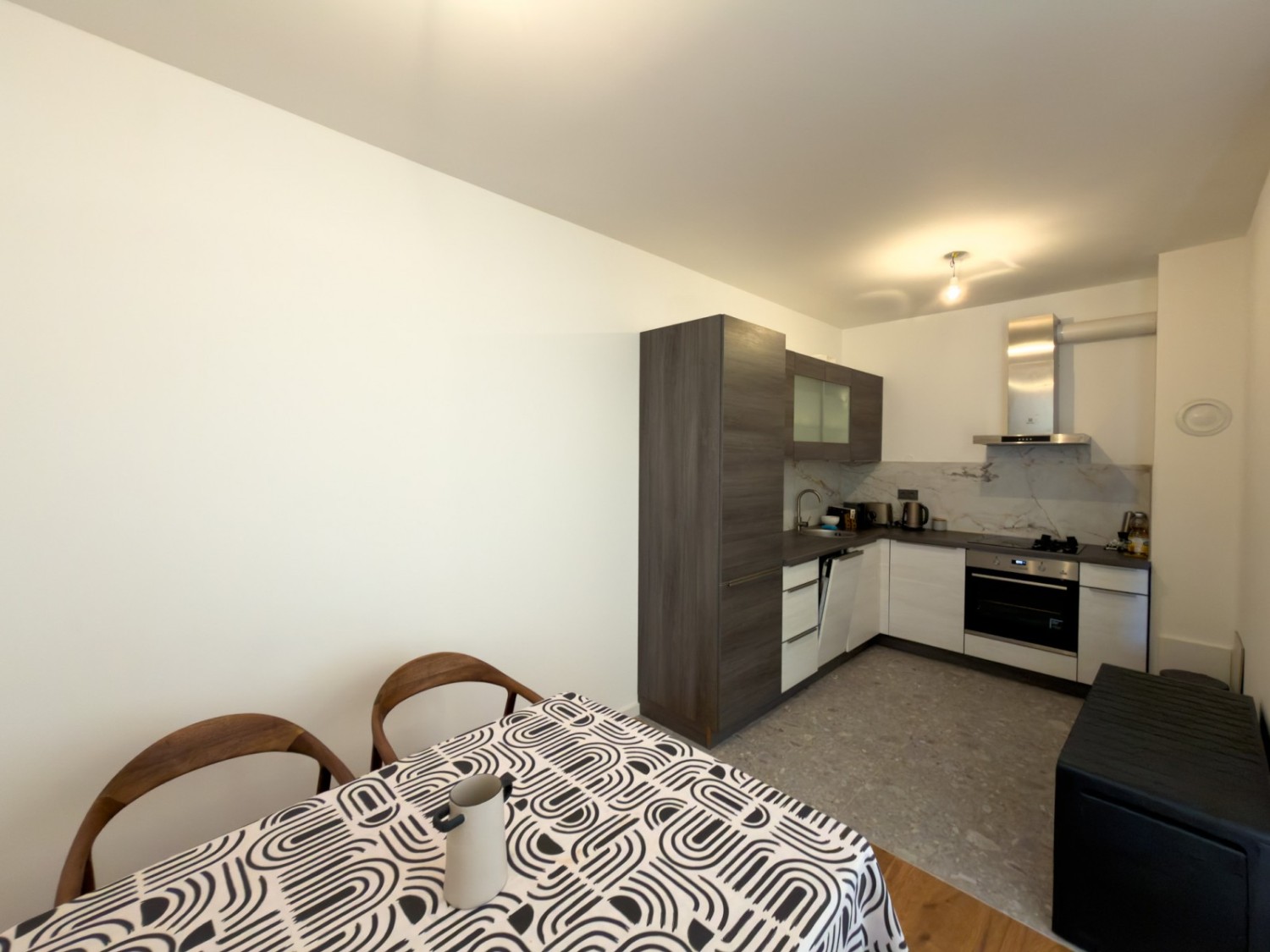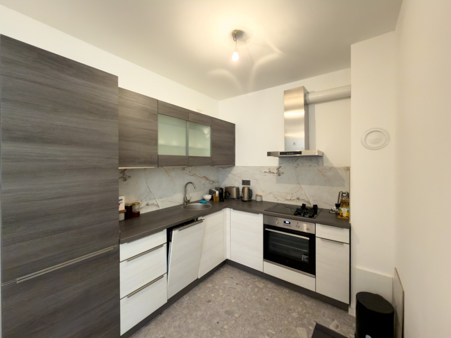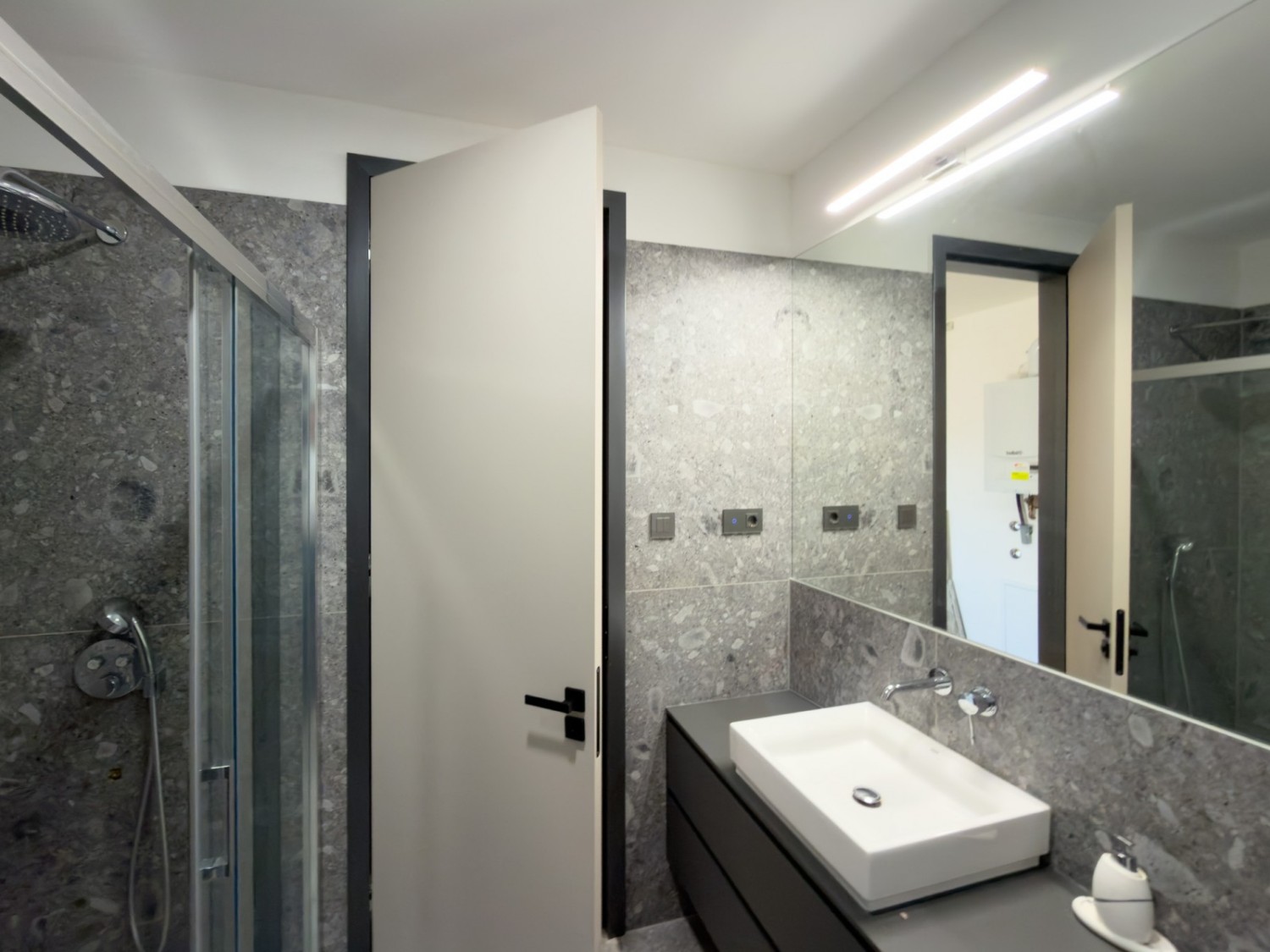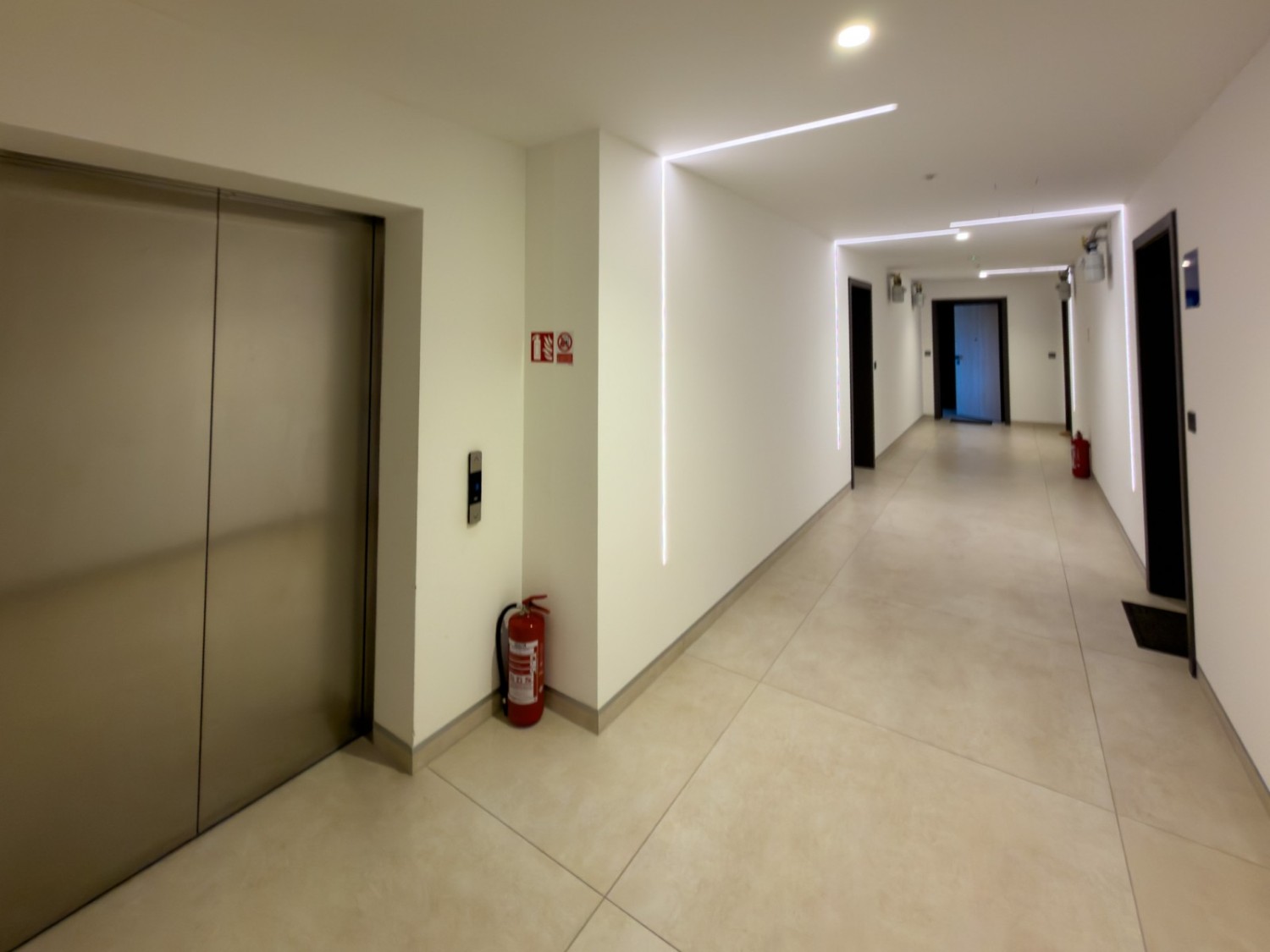 - Keramične ploščice velikih formatov (90x90 in 60x120) v kuhinji, hodniku in kopalnici