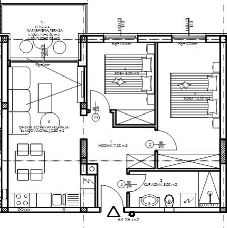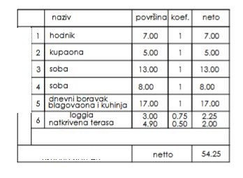 Stan se nahaja v pritličju in obsega hodnik, 2 spalnici, kopalnico, dnevno sobo s kuhinjo in jedilnico ter teraso.