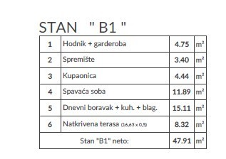 Stan se nahaja v pritličju stavbe in obsega: hodnik + garderoba, shrambo, dnevno sobo s kuhinjo in jedilnico, spalnico, kopalnico in pokrito teraso.