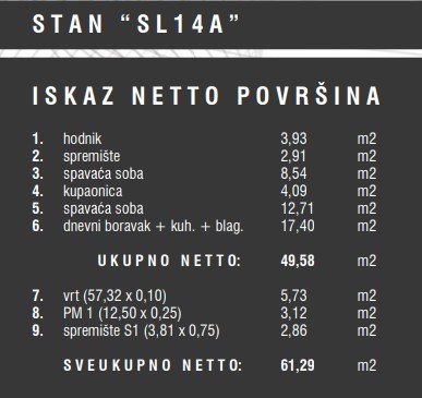 Stanovanje oznake 14A, notranje površine 49,58 m2, se nahaja v pritličju zgradbe in obsega: hodnik, dnevno sobo s kuhinjo in jedilnico, 2 spalnico, kopalnico, shrambo in vrt.