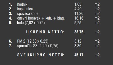 Stan oznake 7C se nahaja v prvem nadstropju zgradbe in obsega: hodnik, dnevno sobo s kuhinjo in jedilnico, spalnico, kopalnico in ložo.