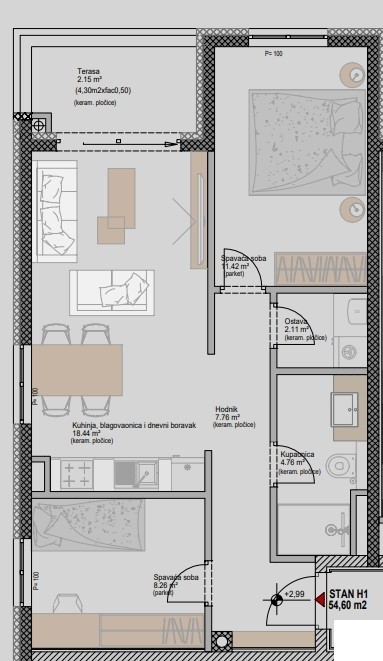Stanovanje H1 sestavljajo predsoba, dnevna soba s kuhinjo in jedilnico, 2 spalnici, kopalnica, utility in terasa.