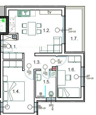 predprostor, dnevno sobo s kuhinjo in jedilnico, dve spalnici, kopalnico ter teraso.