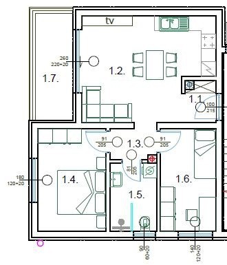 predprostor, dnevno sobo s kuhinjo in jedilnico, dve spalnici, kopalnico ter teraso.