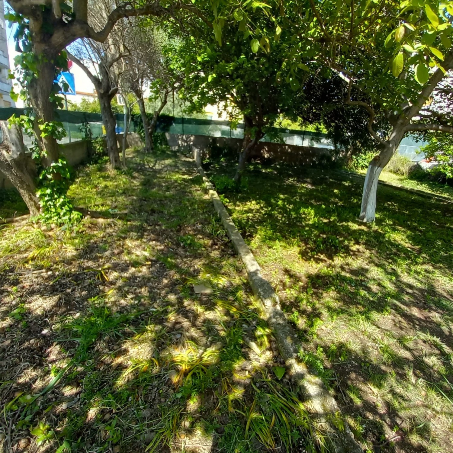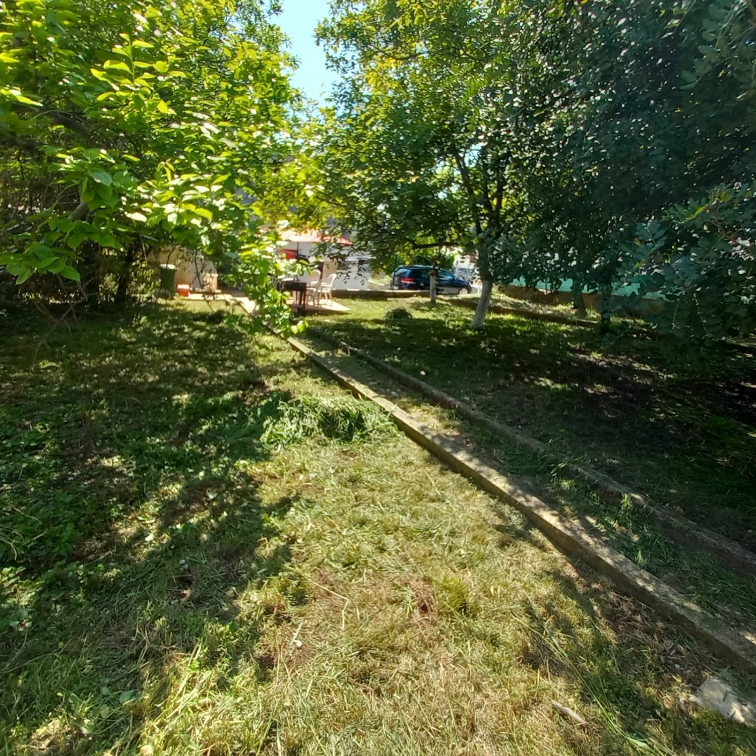 Pred hišo se razprostira prostoren vrt z zrelimi drevesi, ki nudi prijetno senco med vročimi poletnimi dnevi – idealno mesto za počitek in uživanje v naravi.