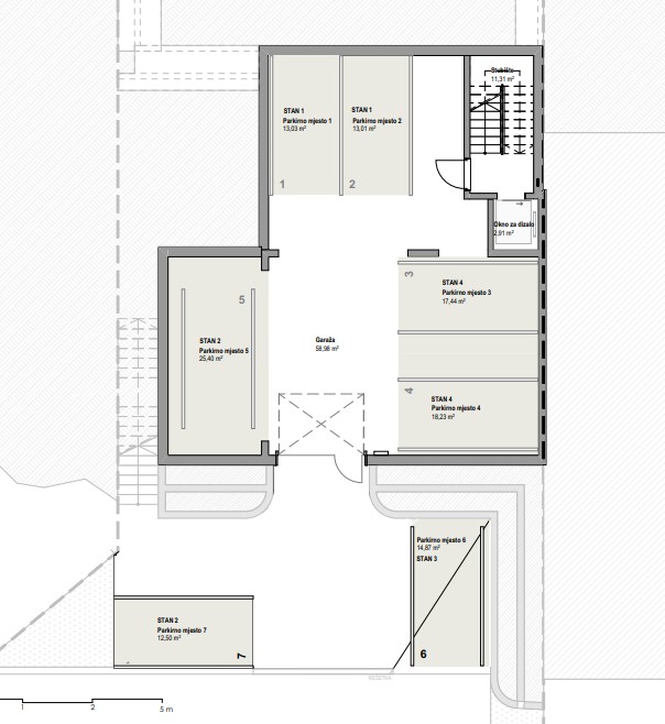 Ta stanovanjski projekt ponuja štiri stanovanja različnih velikosti, razporejenih na štiri nadstropja, z dodatnimi prostori v kletni etaži: