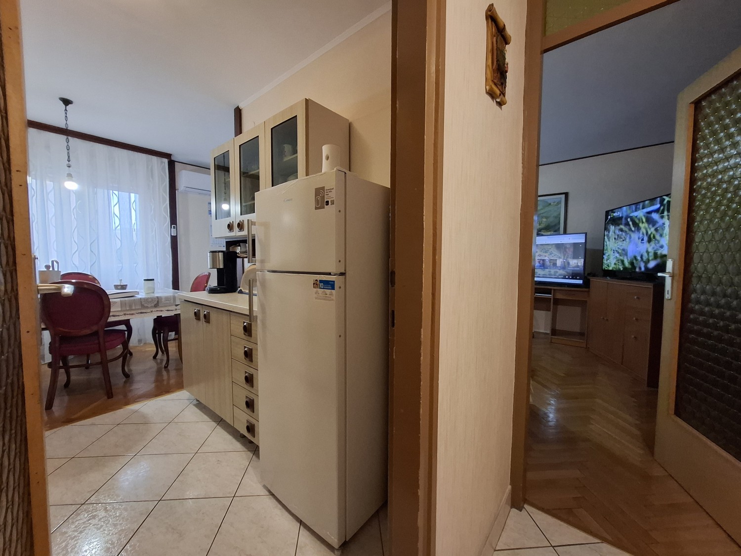 Sestoji iz kuhinje z jedilnico in dnevne sobe z francoskim balkonom južne lege in pogledom na morje.