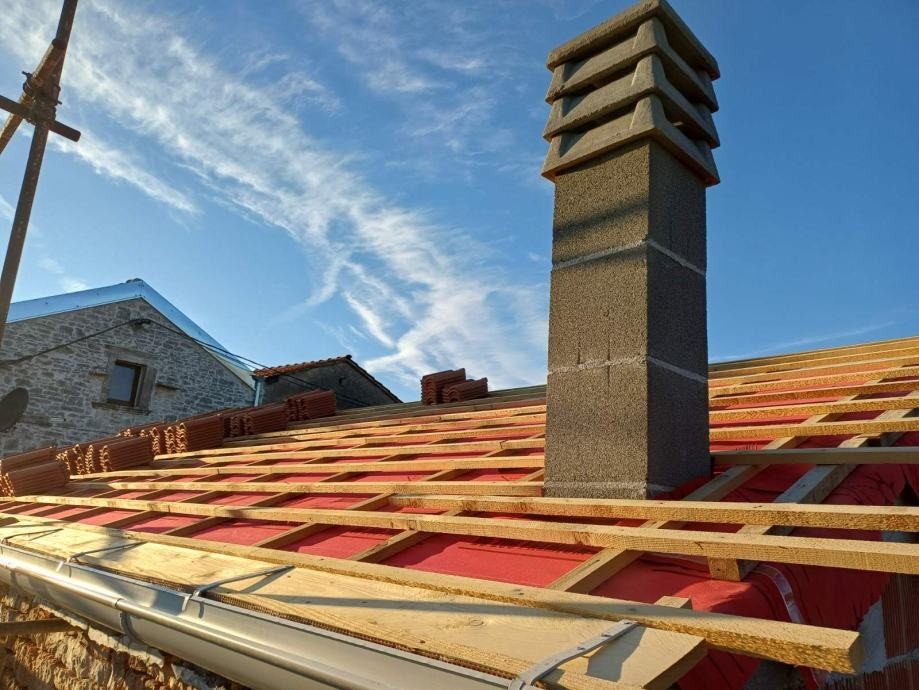 Izdelana nova lesena strešna konstrukcija s popolno izolacijo in končnim pokrovom iz strešnikov "mediteran"