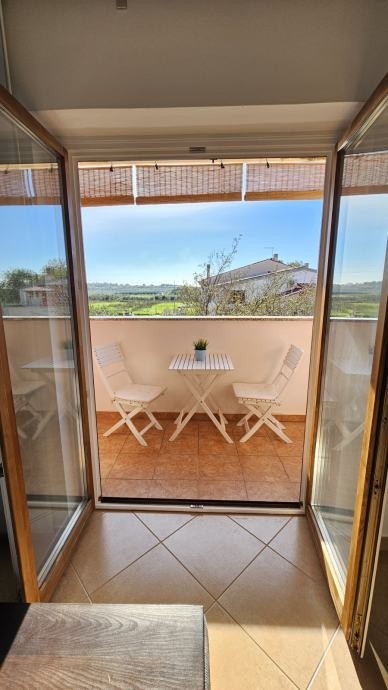 Iz dnevne sobe in balkona je odprt pogled na okoliška polja in vinograde, iz spalnice pa pogled na parkirišče in gozd.